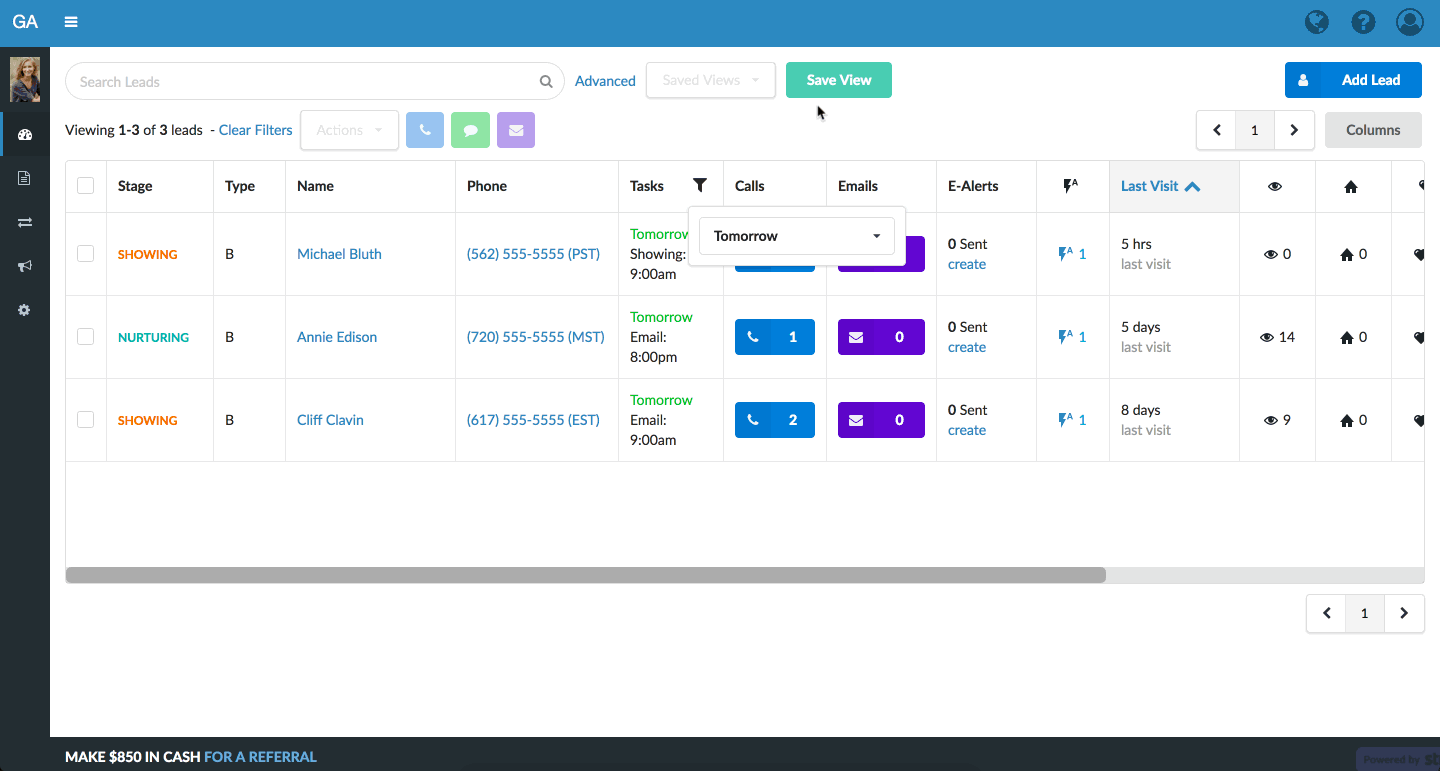 Saved Views are the easiest way to create dynamic lists of leads based on how you manage your book of business.