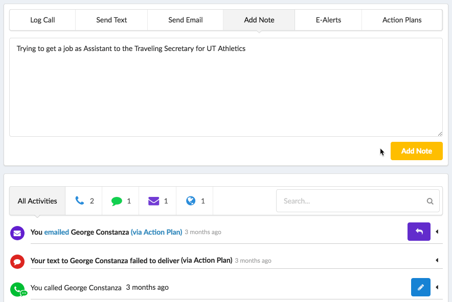 From the Action Menu on the right-hand side of the page, click on the Add Note tab. From there, you can type information and add it to your timeline for future reference.