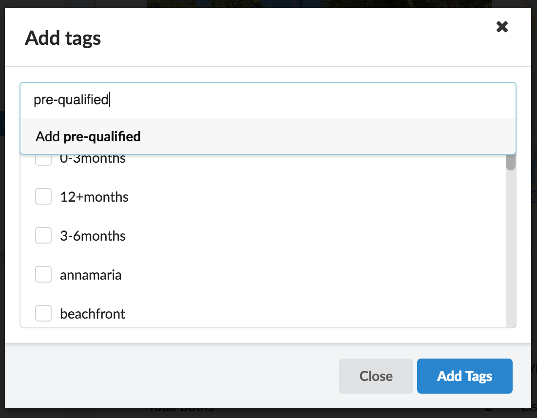 To add a previously unused tag to the CRM, click the +Add New Tag link, which will open the Add Tags modal. From there, type the new tag into the "Search tags..." text field. Once you have typed the full tag name, click the Add [tag name] option below the text input field.