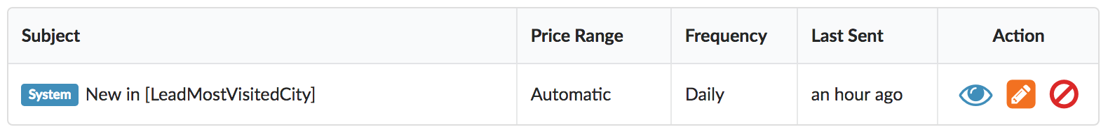 - The view (blue) icon allows you to see a preview of the properties that will be via the associated E-Alert