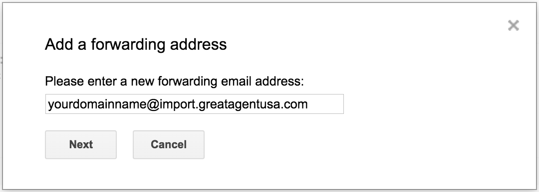 - In the pop-up that displays, paste your Great Agent import email address into the provided field and click "Next"