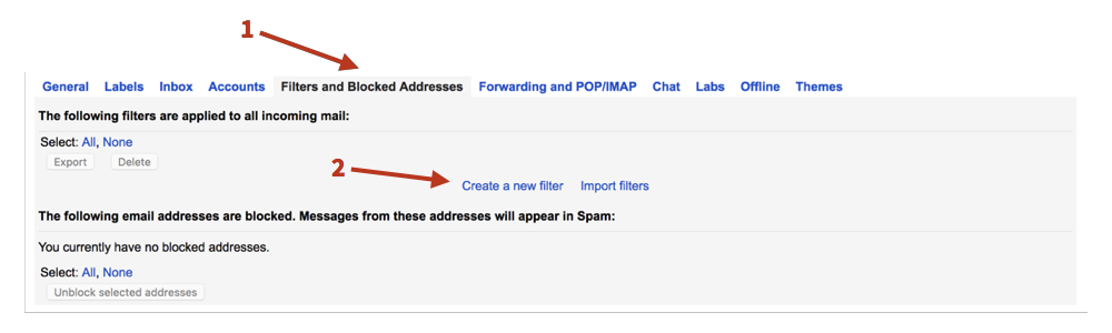 - Click on the "Filters and Blocked Addresses" tab in your Gmail settings