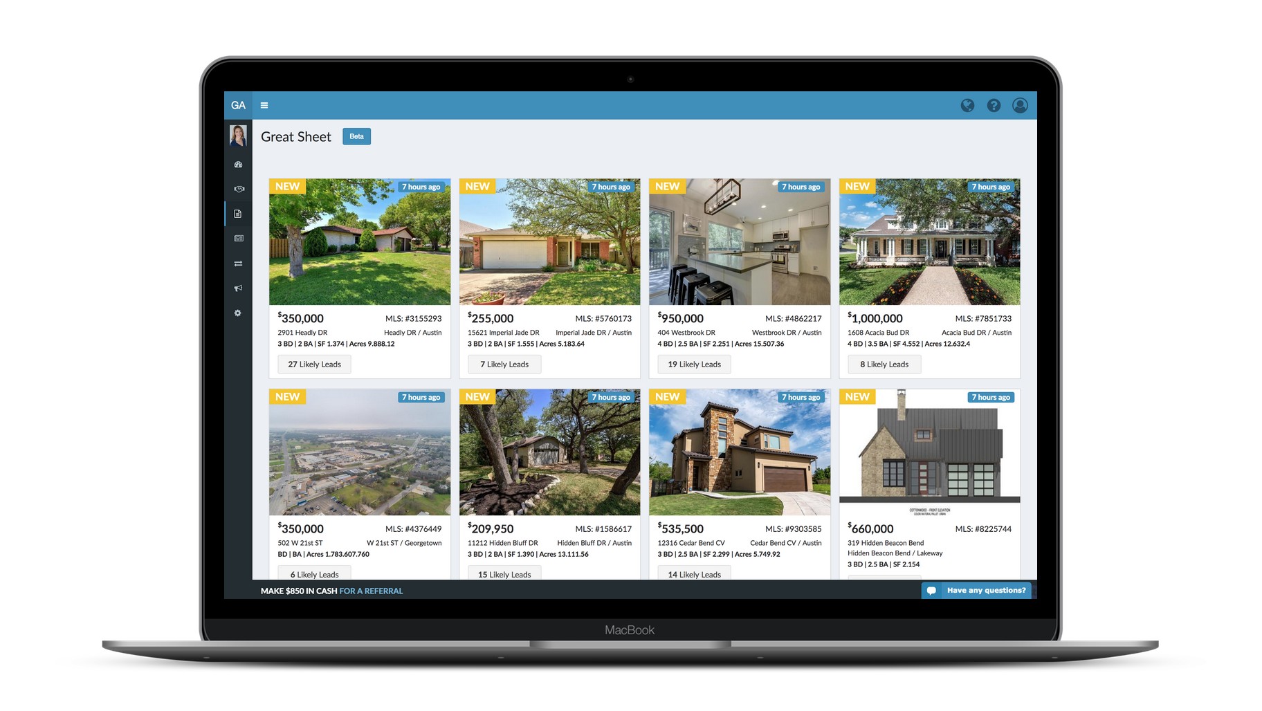 The Great Sheet lists properties based on when they hit the market or reduce in price. On each listing, you will see a button that lists the number of "likely leads" which match that property. If you click the Likely Leads button, you will be directed back to the lead command center and your leads will be filtered to only display the leads which matched the property selected within Great Sheets.