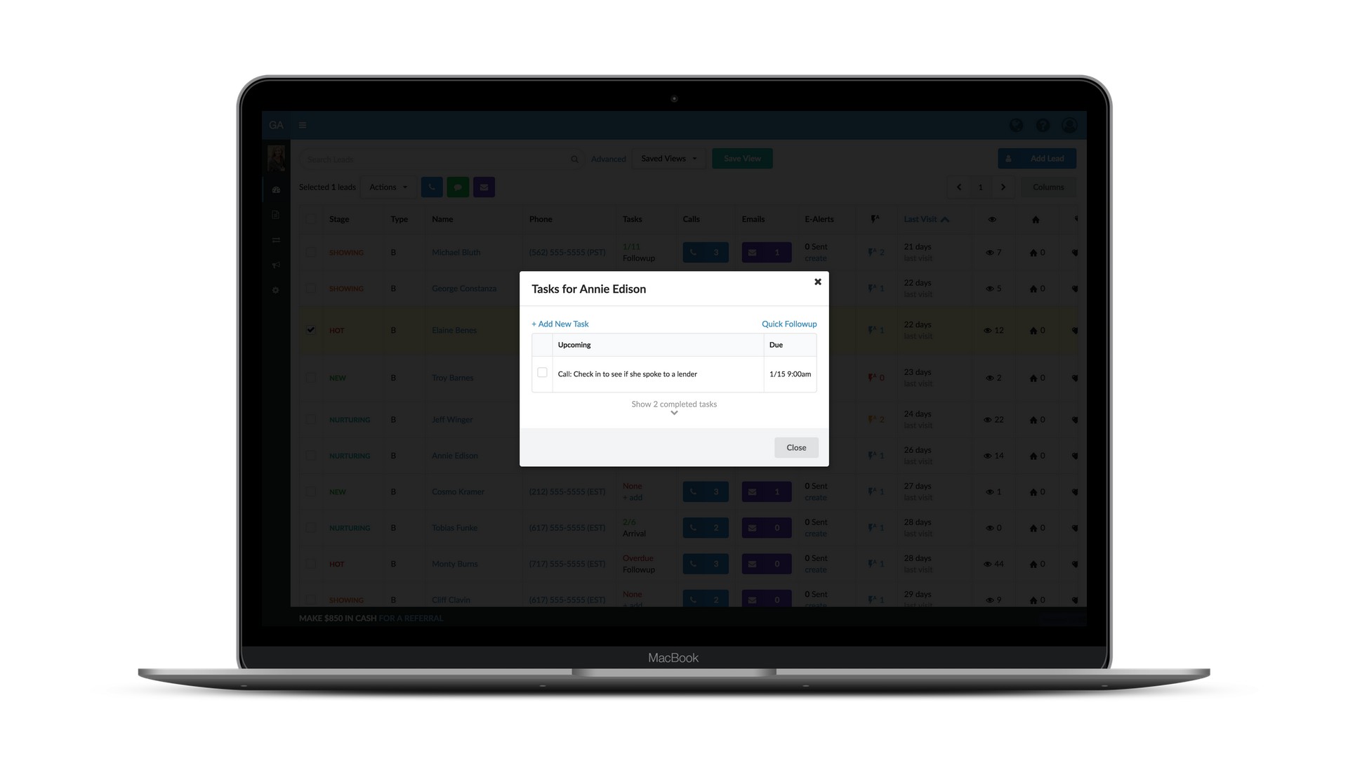 Just click on the task for the desired lead and you can view a list of all upcoming (and completed) tasks in the task modal.