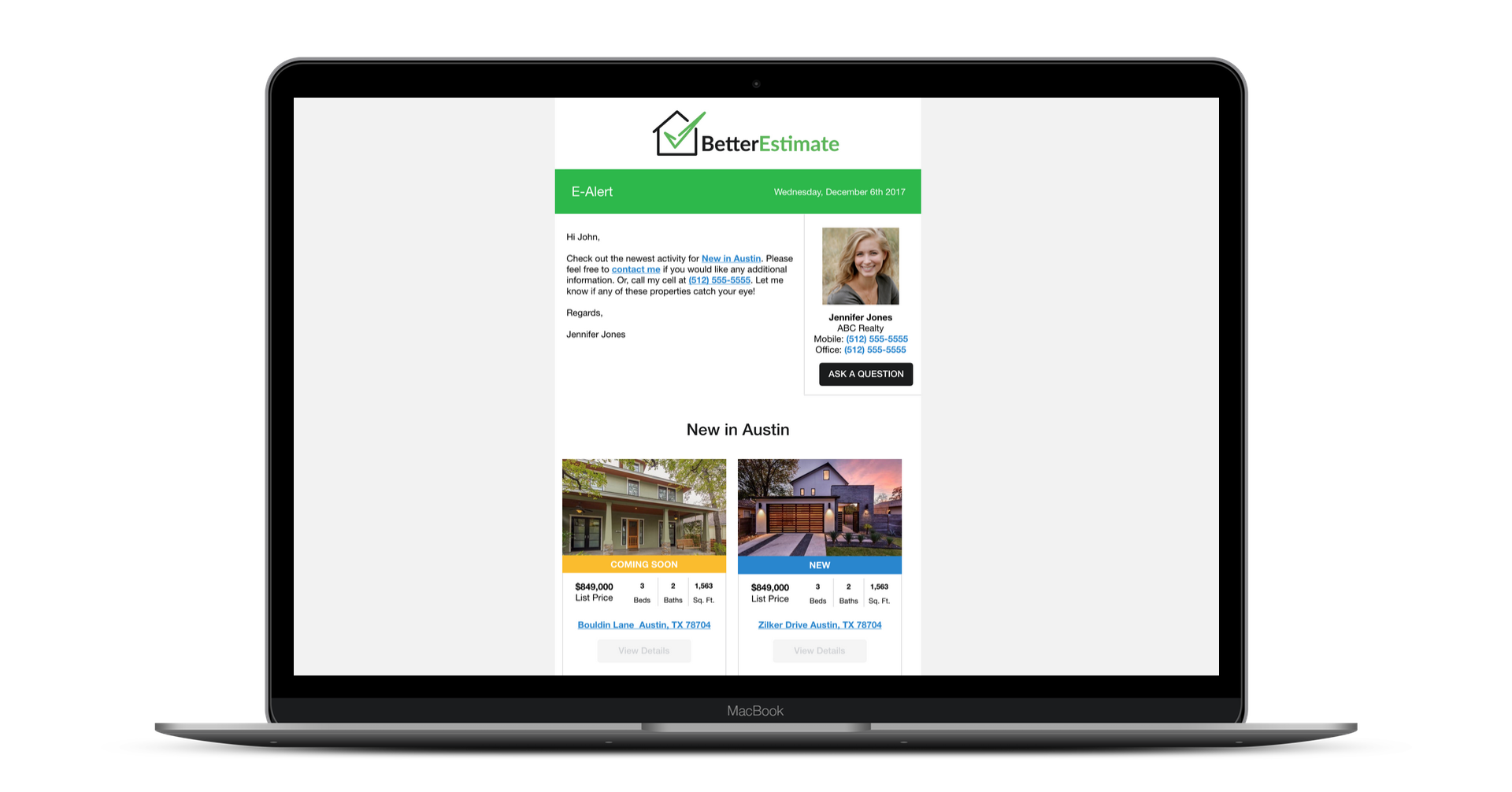 Each E-Alert is branded with your logo and colors. They also include contact information and a picture for the assigned buyer agent.