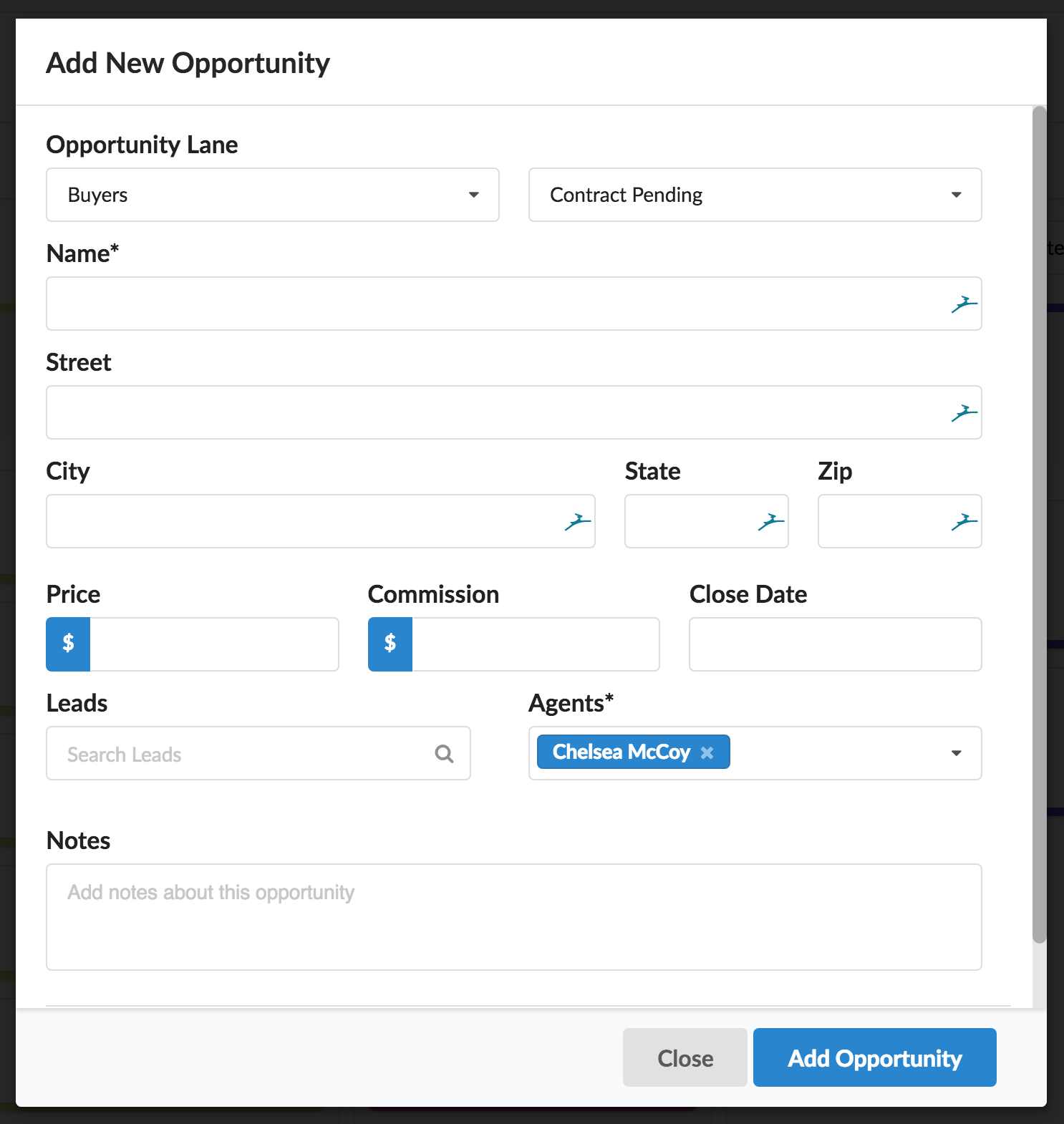 First, give the Opportunity a unique (required) name (e.g. Anderson family or 2 BR Condo Downtown). You then have the ability to add additional information to the Opportunity, such as: the property address, home price, commission, close date, and additional notes.