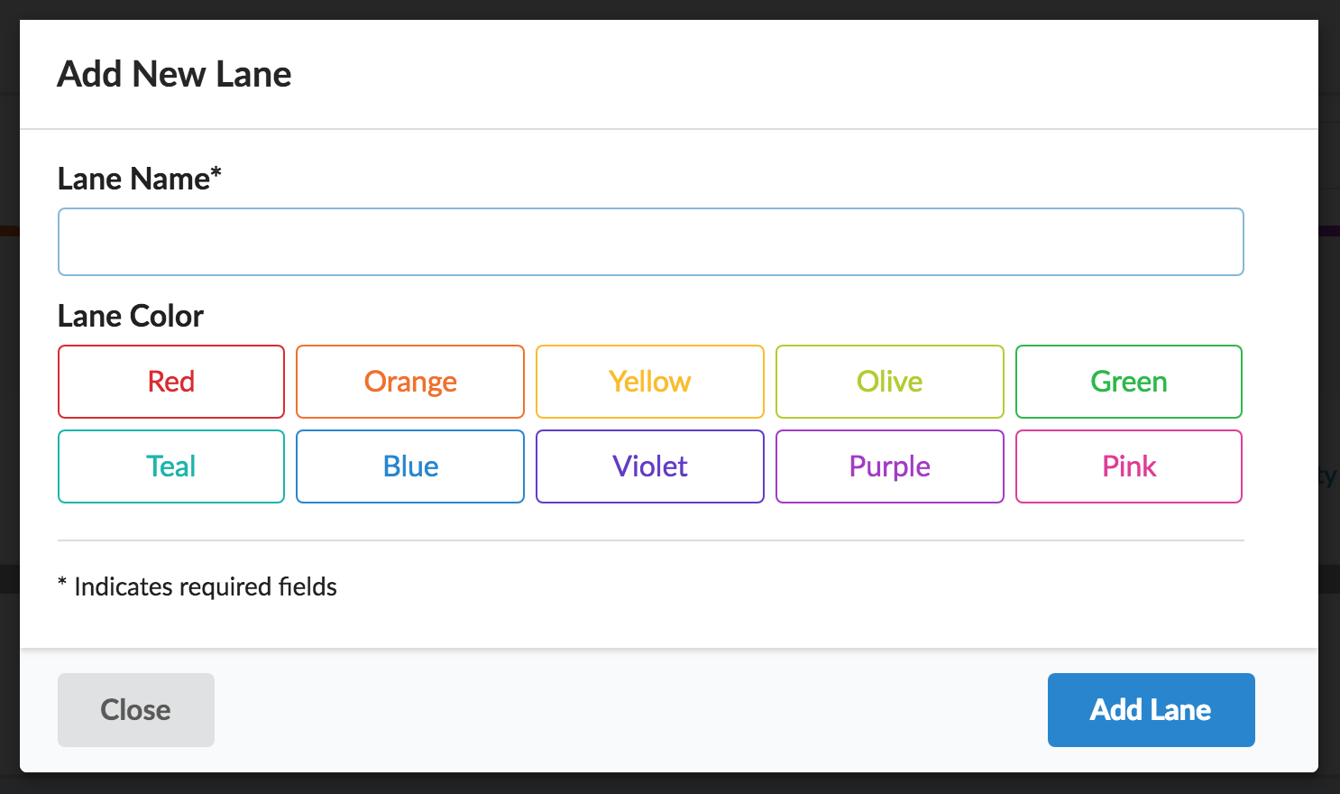 Simply give the Lane a name and select a color to represent that stage of the Pipeline.