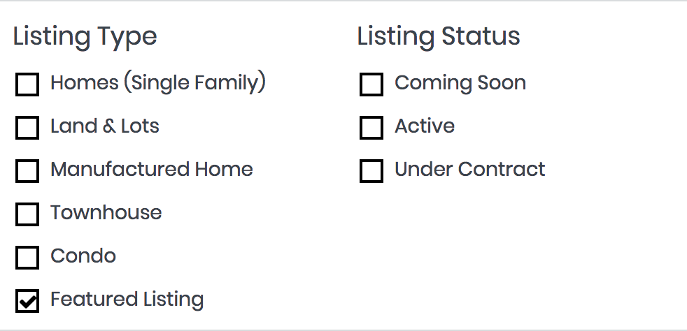 To ensure that you see your featured listing, make sure to select the "Featured Listing" option under Listing Type. At that time, your properties will be displayed.