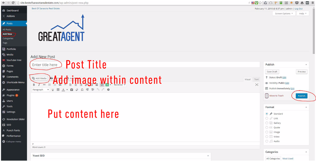 - If done with content things, click the “Publish” button on the top of the right sidebar menu